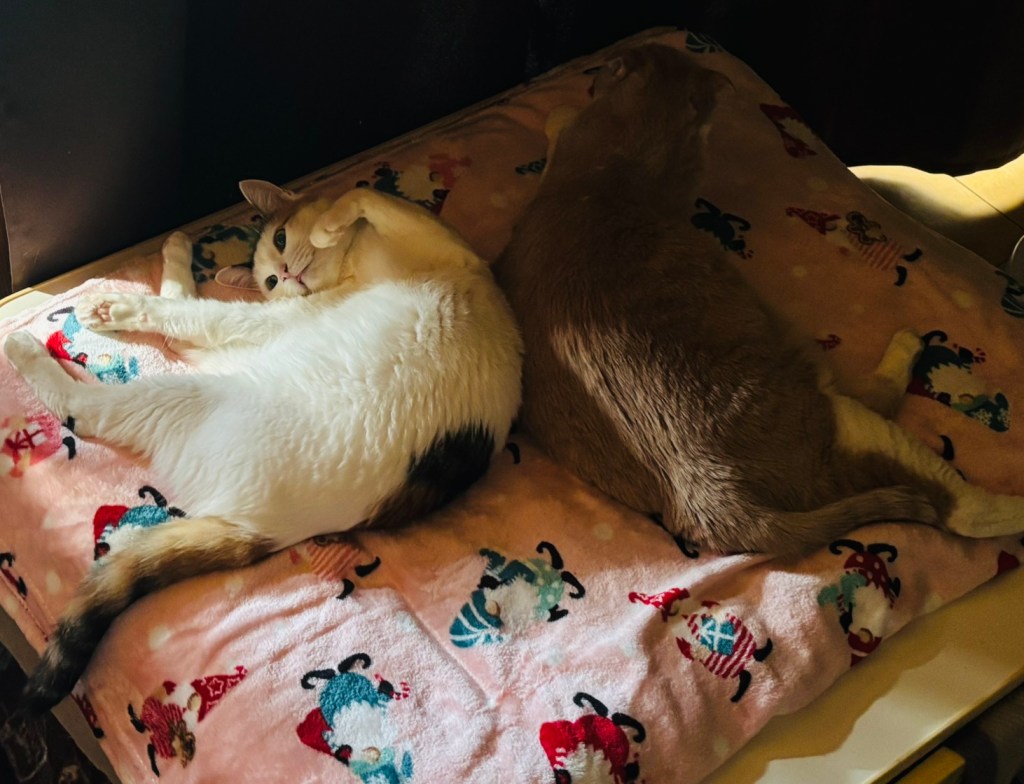 温かいこたつの上で丸々っている2匹♪