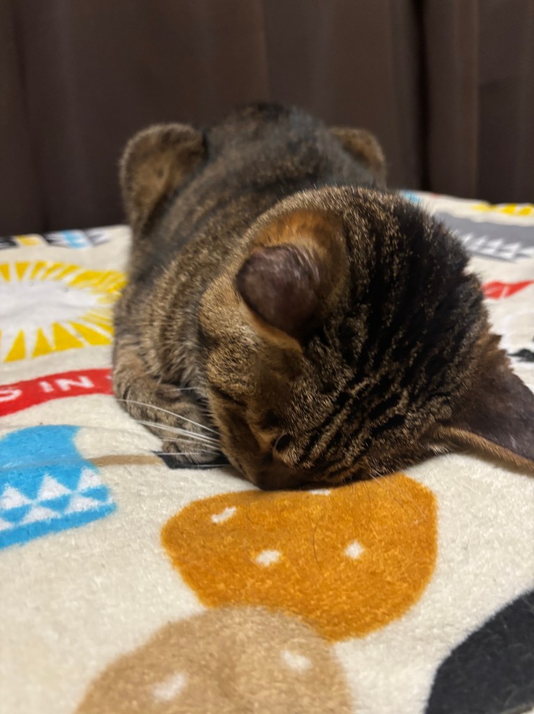 タイトル「ごめん寝」謝っているように頭を下げてそのまま寝ているチビくん♪