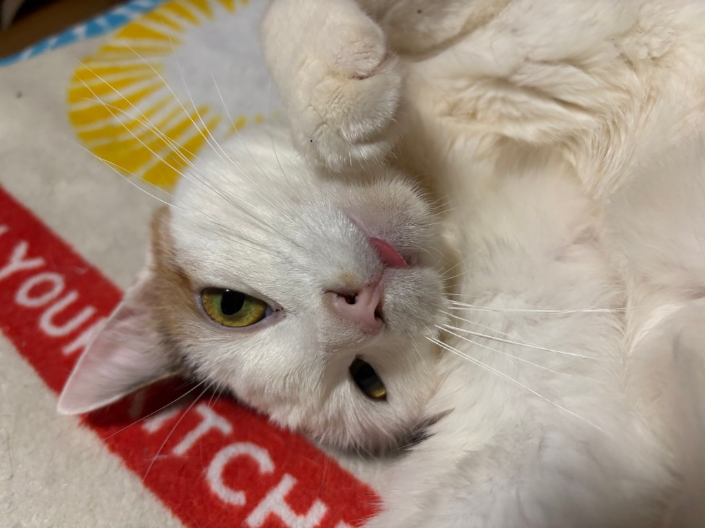 かわいいポーズで寝そべった状態でベロを出している、ミケラちゃん♪