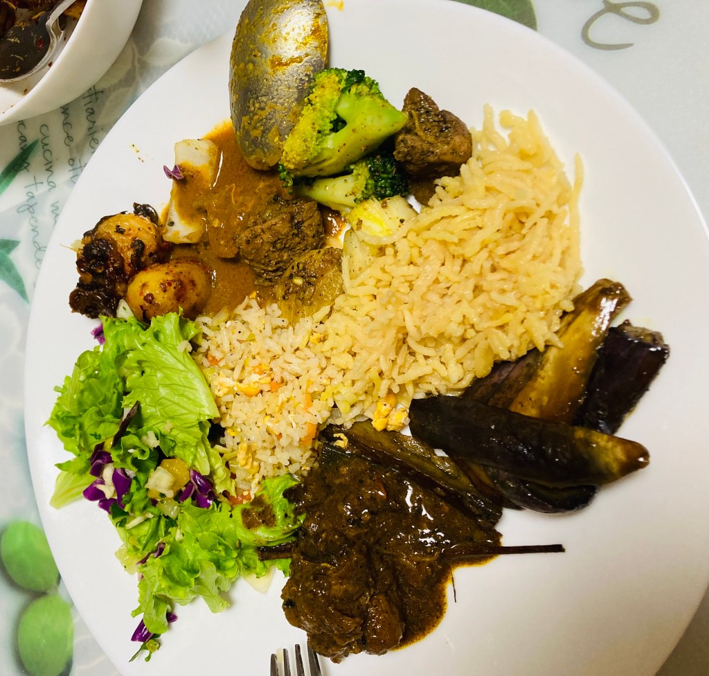 ラムカレー、チキンカレー、ナスの炒めもの、ポテトの炒めもの、チキンとブロッコリーとたまねぎの炒めもの、盛りだくさんのディナーでした。